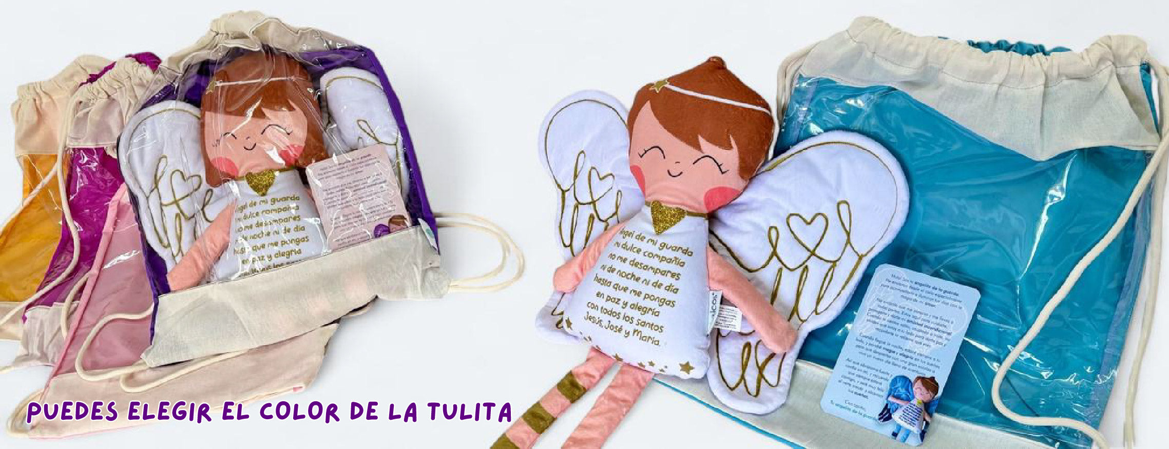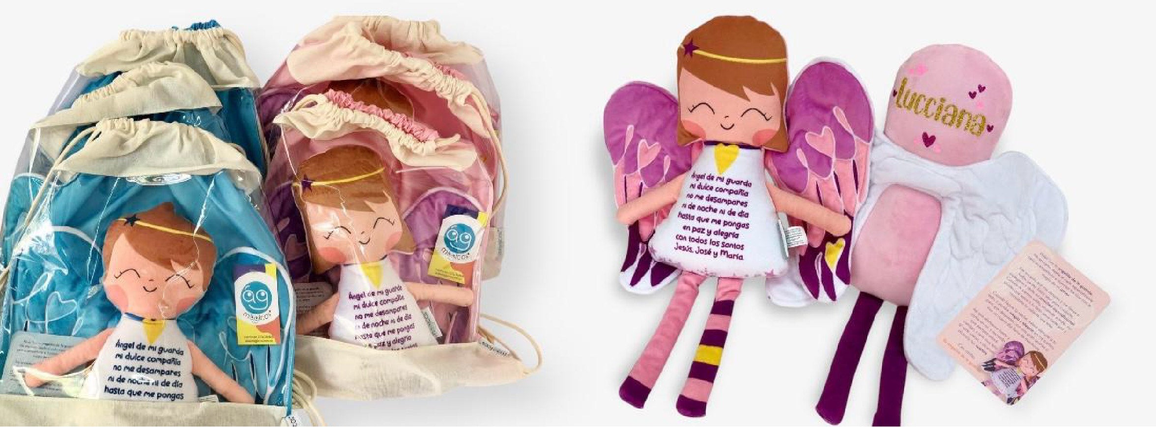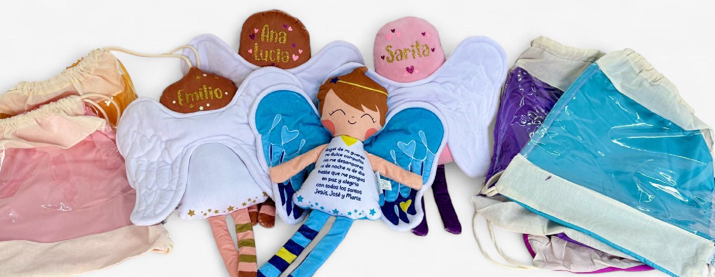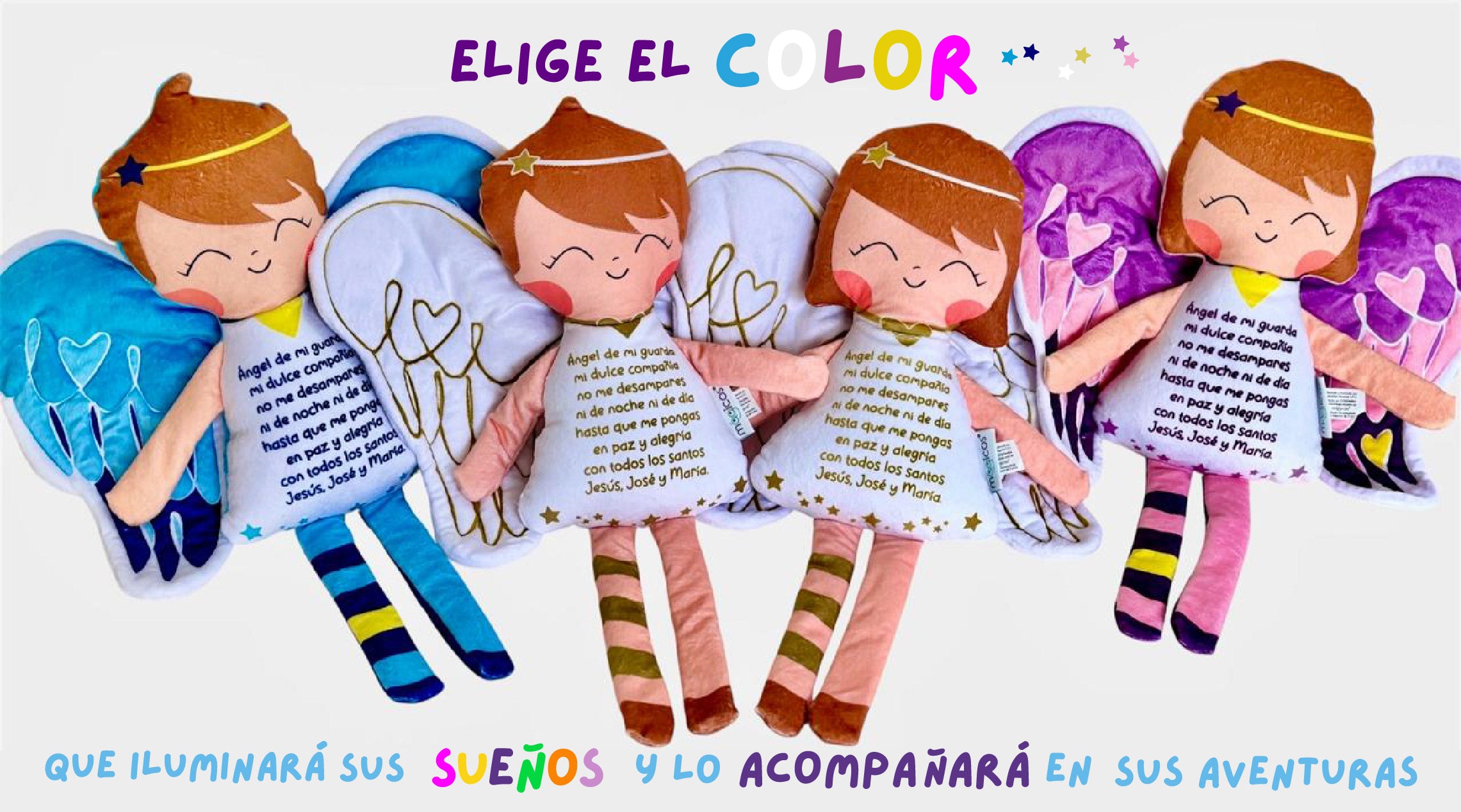 Cada angelito lleva la Oración del Ángel de la Guarda escrita en su vestidito, para enseñar a los niños a rezarla de una manera sencilla y especial. Así, no solo se convierte en un compañero de juegos y sueños, sino también en una forma de transmitir valores, fe y confianza desde la infancia,